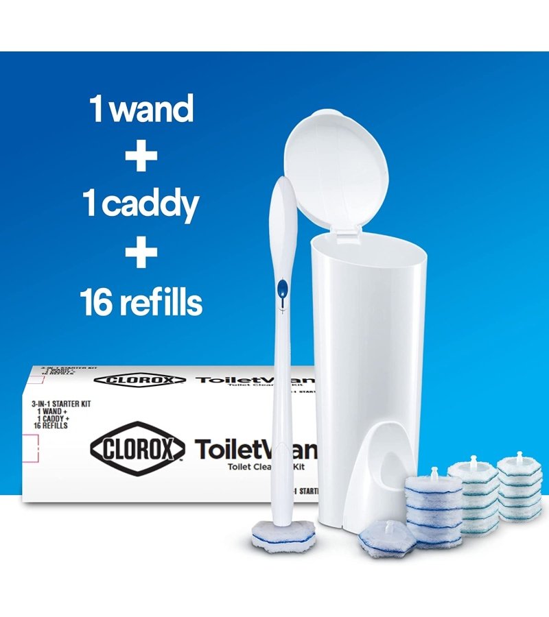Toilet Cleaning system: Add this toilet bowl Cleaner to your cleaning supplies includes 1 toilet wand. 1 storage Caddy. 6 original disposable refills plus 10 Rainforest rush scented refills that kill 99.9% of bacteria and viruses; packaging may vary