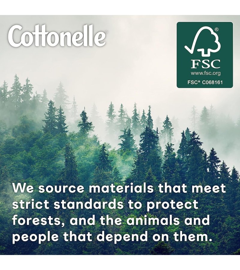 FSC-CERTIFIED TOILET PAPER: Cottonelle is FSC certified ensuring we source from responsibility managed forests to prevent deforestation and only uses fibers that are 100% plant-based and free of harsh chemicals.