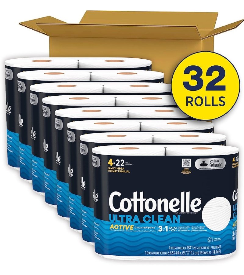 32 FAMILY MEGA ROLLS: Cottonelle Ultra Clean Toilet Paper with Active CleaningRipples Texture. 32 Family Mega Rolls (8 packs of 4); 388 sheets per roll .