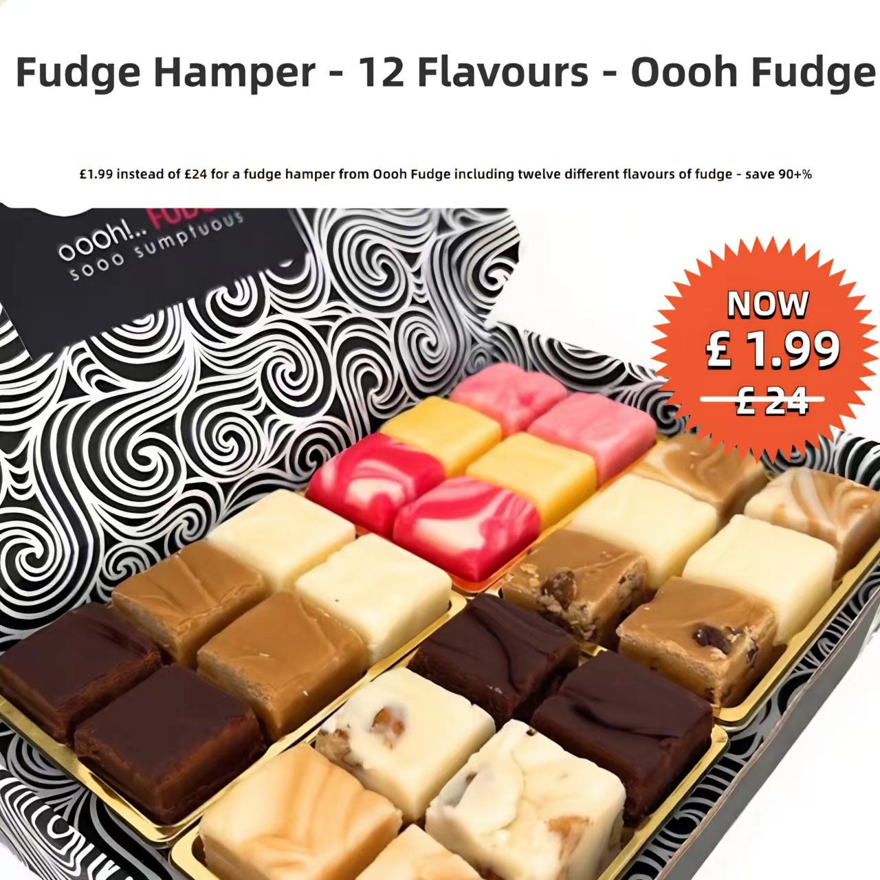 We’re offering you a luxury fudge chocolate hamper for just £1.99, saving you 90+% off Oooh Fudge’s price of £24.