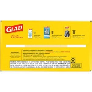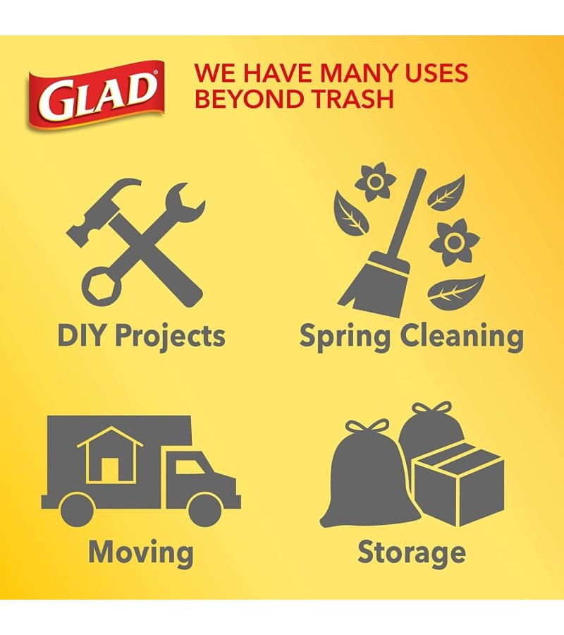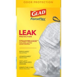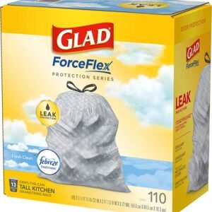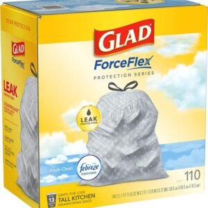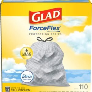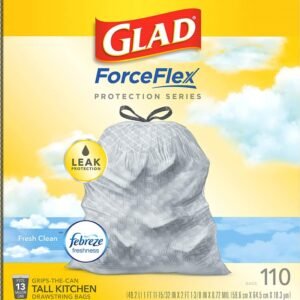 13 GALLON PLASTIC TRASH BAGS: Glad Tall Kitchen Drawstring Trash Bags with stretchable strength. traps. locks and neutralizes odors to keep your kitchen smelling fresh with a Fresh Clean scent; Package may vary
