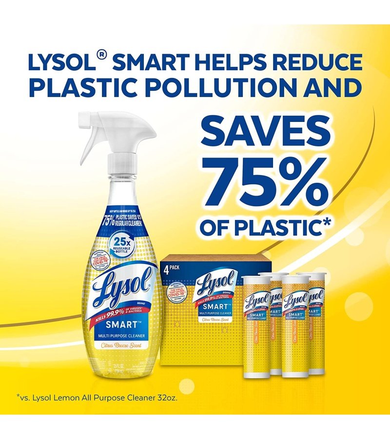 LYSOL SMART HELPS REDUCE PLASTIC POLLUTION: by using 75% less plastic than Lysol Lemon All Purpose Cleaner 32oz