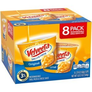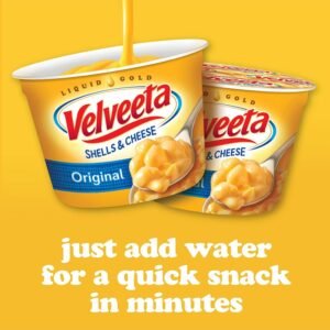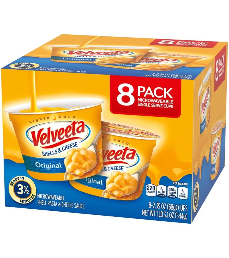 VELVEETA SHELLS & CHEESE: 8 ct box of Velveeta Shells & Cheese Original Microwaveable Shell Pasta & Cheese Sauce. 2.39 oz per cup