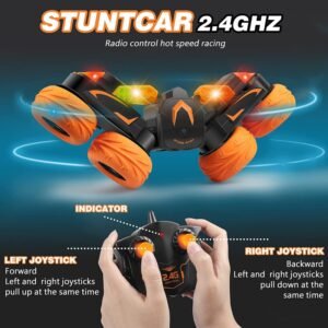Amazing RC Stunt Car:This fantastic RC cars can goes front back side to side. double side tipping bucket. double-side roll. 360 degree complete flip overs and jumping. 3D deformation. rolling handstand walking. move round obstacles automatically. which will bring you and your lovely kids tons of fun!